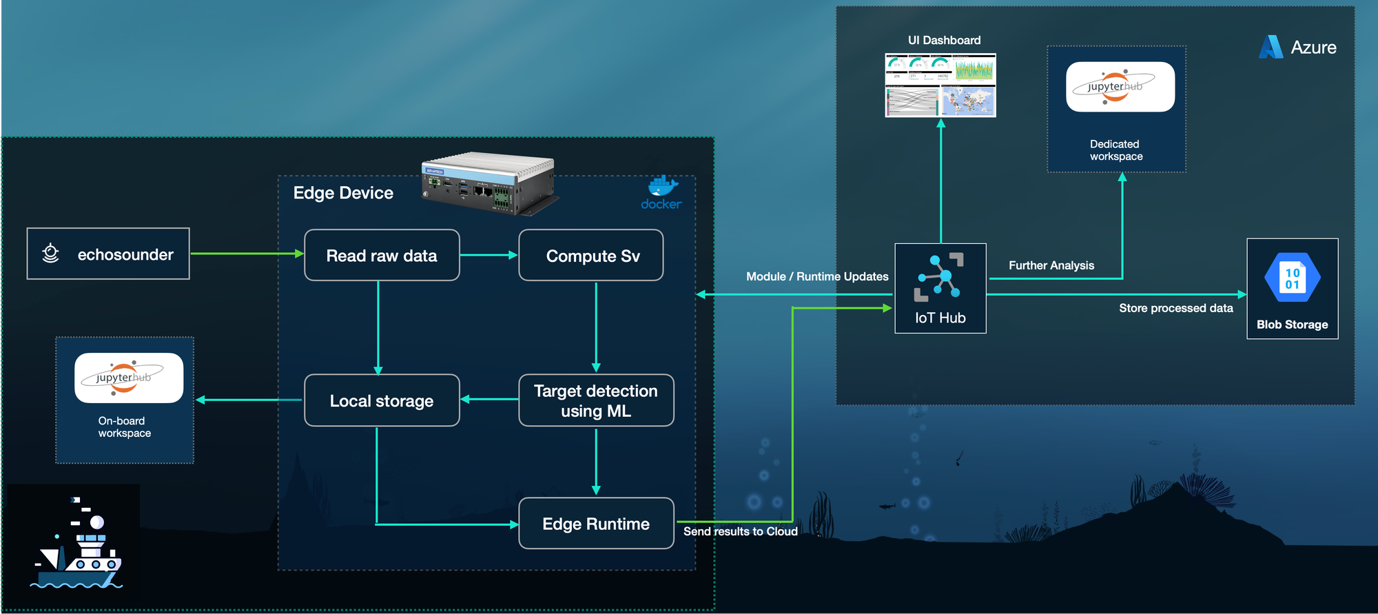 - raw data is streamed from the echosounder and auxiliary sensors (such as CTD profilers and GPS) to the IoT Edge processor;