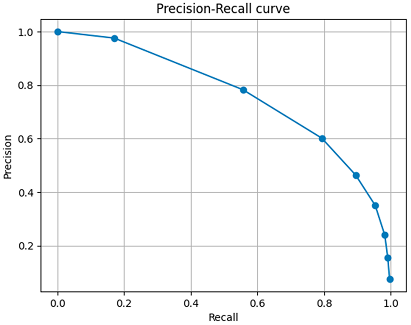 The precision–recall curve highlights how precision declines as recall increases. A threshold of 0.5 yielded the best balance for this dataset.