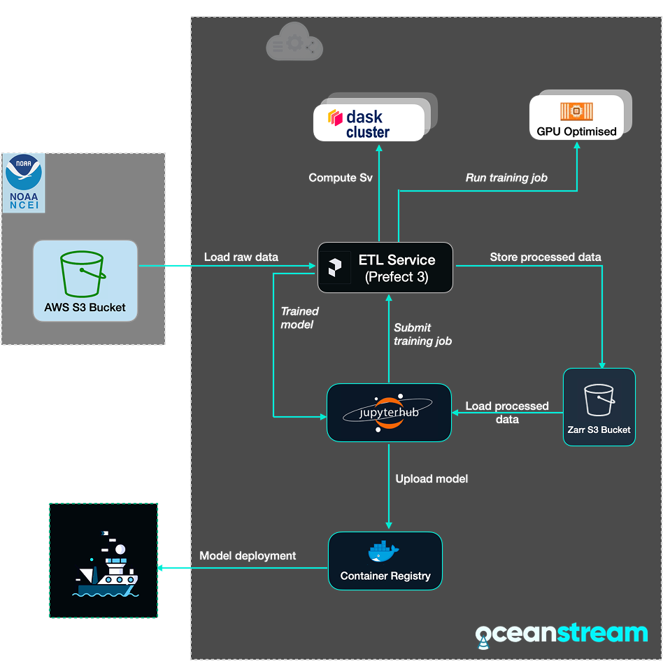 - EK60 raw data is loaded from the NOAA S3 bucket together with annotations